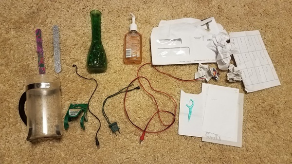 - An old wire I found when I moved a shelf to get a key that had fallen. Then 2 more cord pieces I found in the yard…yes the yard.