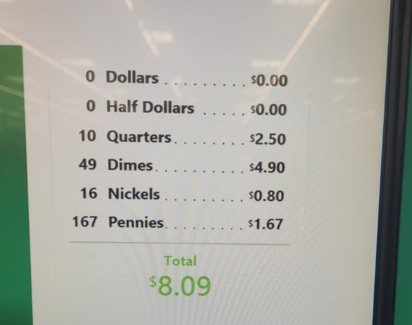 I had a total of $9.87! Plus 4 pennies the machine rejected and a Chuckie-Cheese Token.