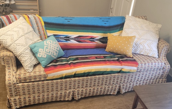 We’ll see after a while if all these blankets and pillows start getting in our way and annoying us or if my let me go boho for the sake of covering the worn couch upholstery trick works.