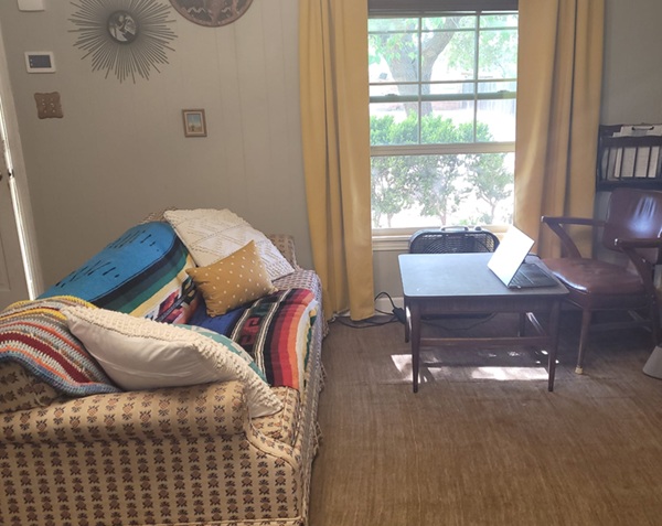 I’m saving money by not replacing or re-upholstering our couch yet. We love this thrifted couch. It’s a perfect size for our living room, but the fabric is getting grungy and wearing holes. So I’m trying filling it with blankets and pillows. I feel like this gives it a boho look. Now I have a colorful Mexican blanket, an afghan crocheted by my great grandma, and 4 pillows. The 2 white pillows and the yellow one, I recently purchased at Goodwill for under $10 total. I took the cases off the white ones and washed them along with the little yellow pillow. This yellow one is replacing another yellow one, but it matches the curtain color better than the previous one.
