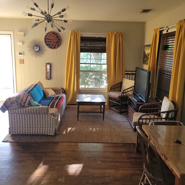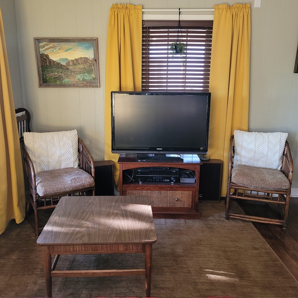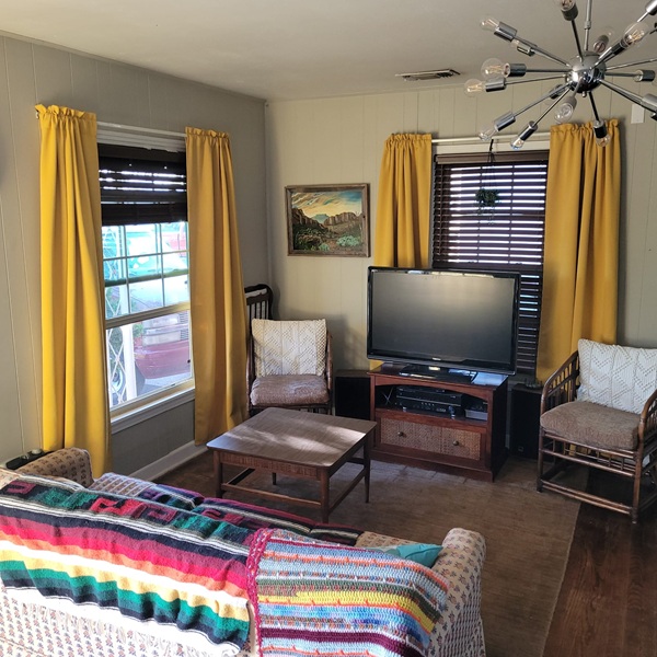 Now back to the chairs….Our living room isn’t very large, and it shares the space with the dinning table, so we’ve always tried to have smaller furniture in it. However I felt like one more chair would be nice, especially for when we have company. I’ve been keeping my eyes peeled on fb marketplace and thrift stores, but hadn’t found anything that really was what we wanted. Then at the garage sale, there was this pair of matching chairs! They fit the bill! Now that they’re in the living room we moved the wooden chair to our bedroom to replace the white chair in there. The white chair then got sent off to Goodwill. I paid $30 for the set. We ended up removing the back cushins and are using the white throw pillows I recently bought instead.